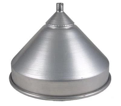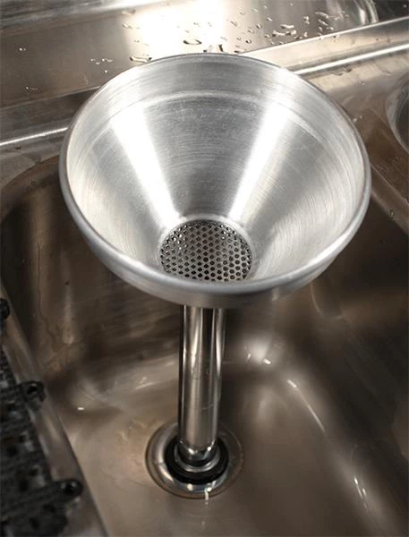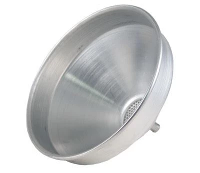 A great strainer funnel design for all of your straining needs. This 2 quart aluminum funnel works well to keep waste such as straws and fruit left over from a drink from clogging up your sink. It can also be used as a food strainer for in the kitchen. The 2 quart size will fit on most bar sink plugging pipes. It is well constructed featuring built-in air vents and a satin finish.