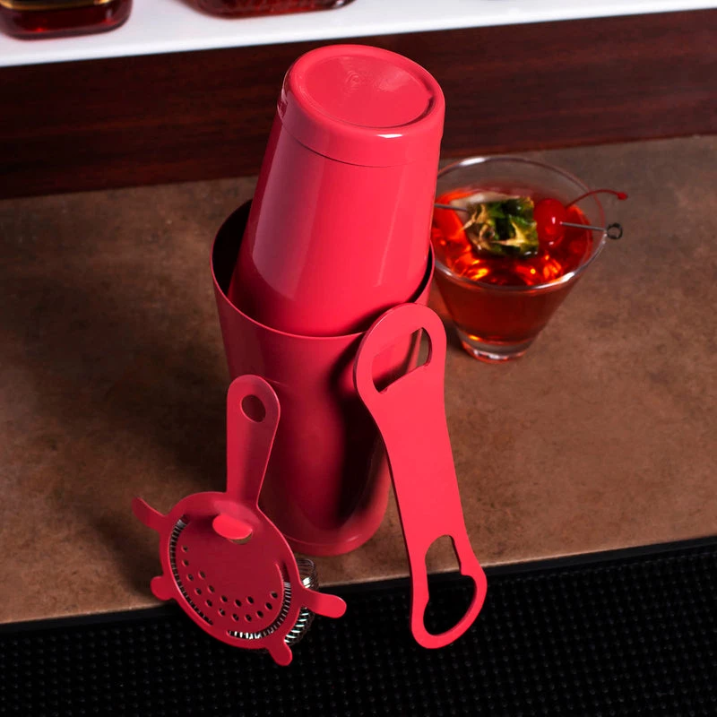 This 4 piece Rose Pink bar set is equipped with everything you need when making cocktails for your guests. Not only can this set get you started, but it also makes the perfect gift for your bartending friends. It is made of durable stainless steel and has a bright reflective color making it stand out in your bar. This set includes a 28 ounce and 18 ounce shaker tin, a 4 prong strainer, and a V-Rod® opener.