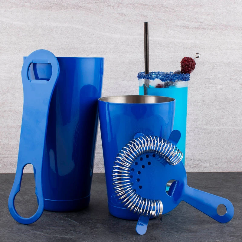 This 4 piece Signal Blue bar set is equipped with everything you need when making cocktails for your guests. Not only can this set get you started, but it also makes the perfect gift for your bartending friends. It is made of durable stainless steel and has a bright reflective color making it stand out in your bar. This set includes a 28 ounce and 18 ounce shaker tin, a 4 prong strainer, and a V-Rod® opener.