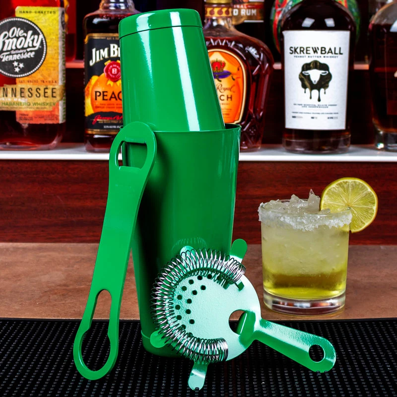This 4 piece bar set is equipped with everything you need when making delicious cocktails. This set not only can get you started, but it also makes the perfect gift for your bartending friends. This set is made of durable stainless steel and has a bright reflective color making it stand out in your bar. Includes a 28 ounce and 18 ounce shaker tin, a 4 prong strainer, and a V-Rod® opener.