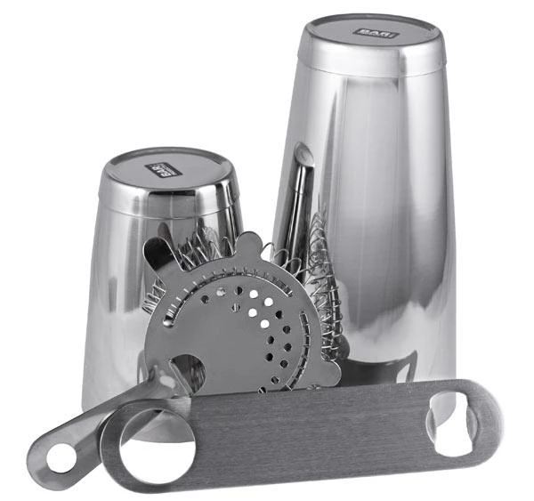 The classic stainless steel bar kit is an attractive and economical way to start into the bartending business or boost your home barware collection with durable, shiny, and practical tools. It includes a 28oz and 16oz dual shaker system, four-prong strainer, and a speed opener for beer bottles. These are the indefensible bar accessories to have on hand, making them a great gift for bartending enthusiasts and bartending students.