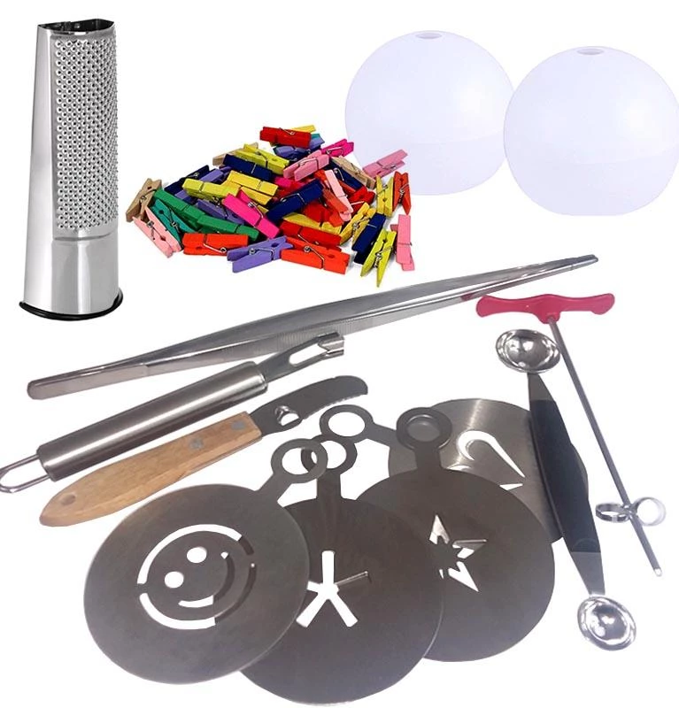It has all the tools needed for making perfect garnish, like twists and spirals from citrus fruits. Serve your favorite dishes and cocktails with beautiful garnish no matter where you are; with the Master Garnish Tool 10 piece set. The garnish clips are efficient in holding garnishes and looking great while doing it! Everyone will love receiving their drinks with these cute little cocktail clips to hold their garnishes in place. Our BarConic® Nutmeg Grater is great for grating fresh nutmeg to use in your signature cocktails, for baking, or for adding flavor to any sweet dish. It also features a removable bottom piece that has a storage compartment for whole nutmeg. Cocktail Stencils provide a fun and interesting way to garnish your craft cocktails. They are versatile and can work for any cocktail, fancy coffee or other beverage.