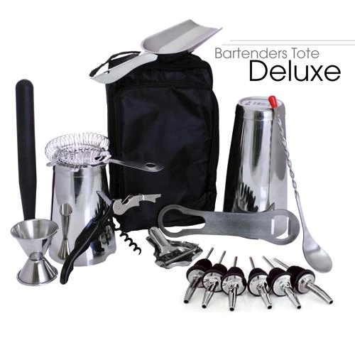 Several updates and advancements have been made to our popular Custom Complete Bartenders Tote Set. We bring you the Stainless Steel DELUXE version. This 17 pc set includes everything a professional bartender needs to work any bar shift and they all fit in a handy, nylon zipper tote bag. The tote bag features 2 zipper compartments designed to perfectly store your bar tools along with a convenient carrying strap.