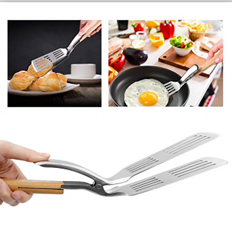 If you’re looking for a unique spatula then you’ve come to the right place. It features a spring-loaded style system that features two spatulas stacked on top of each other allowing you to use it as a spatula or as a set of tongs. It is defiently a tool that is a must have hanging on the side of your grill. It even has a bottle opener on the handle of the spatula! It is made of steel and has a wooden handle. Measures 18.75″ inches.