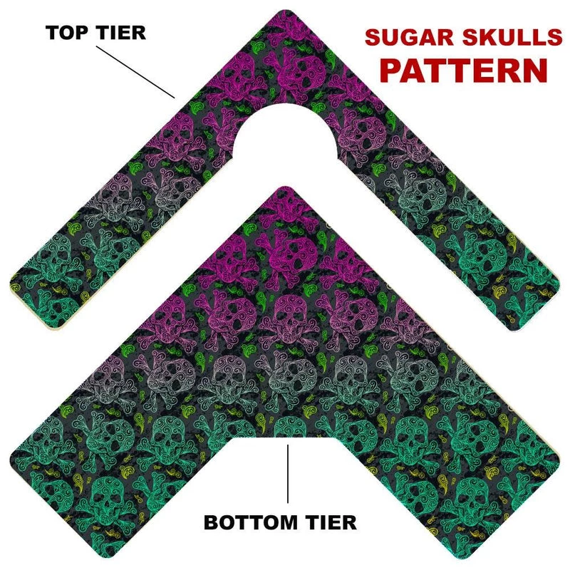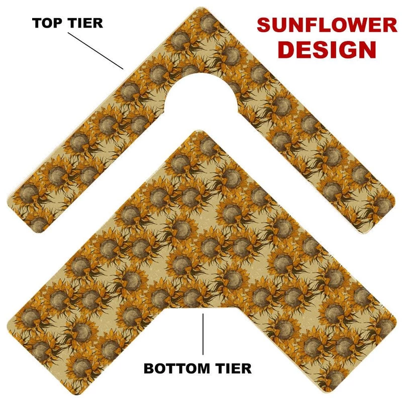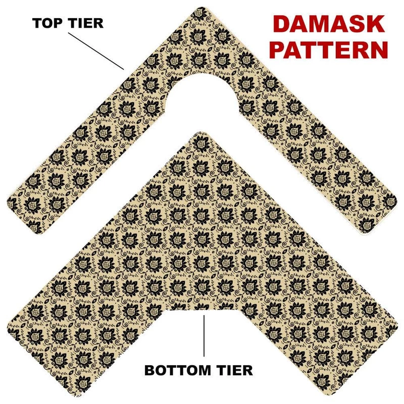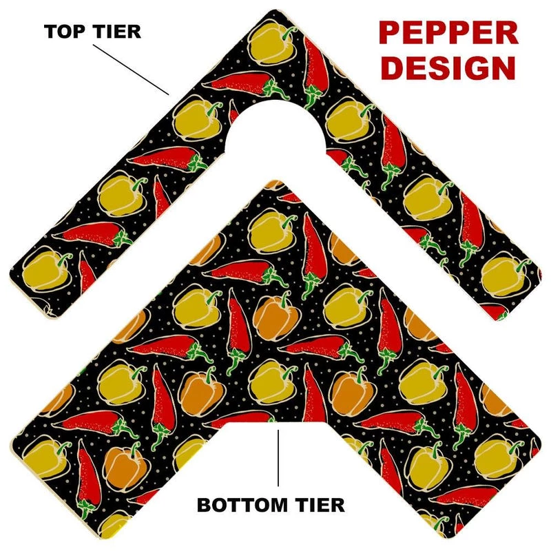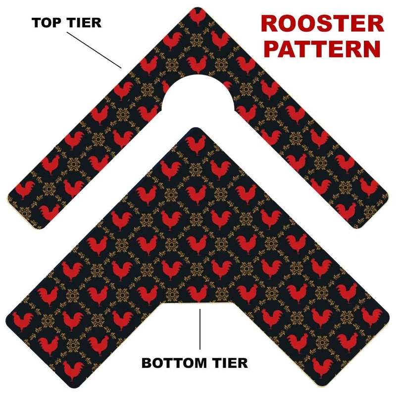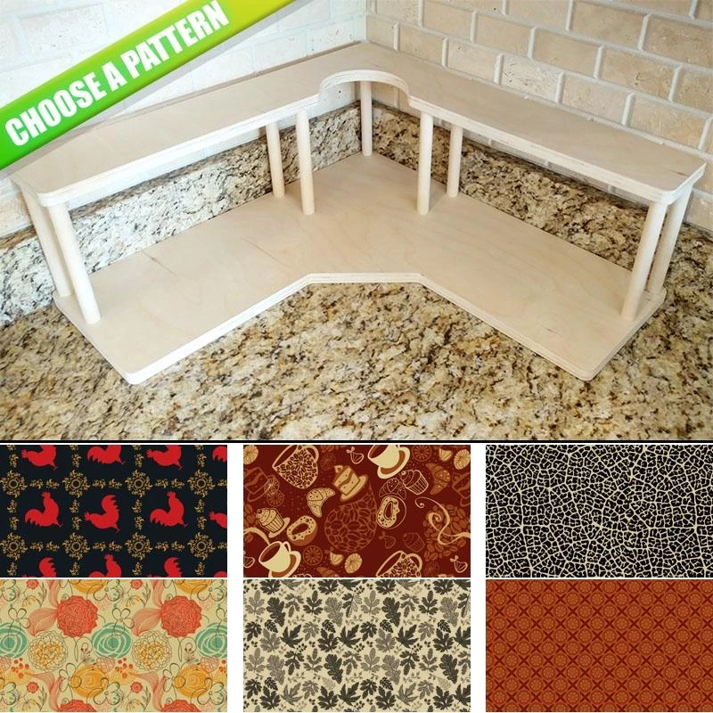 Here is a simple way to choose your Counter Caddy design from several pattern templates. Have the ability to match up your kitchen theme simply by choosing from our wide selection! You also have the ability to choose the height of your unit. The Dowel Rods are available in 3.5″, 5,75″ and 7.5″ heights elevating your second tier to preferred under cabinet heights. The top tier features a half circle cutout that you can conveniently slide up to a 4.5″ diameter trash can into.