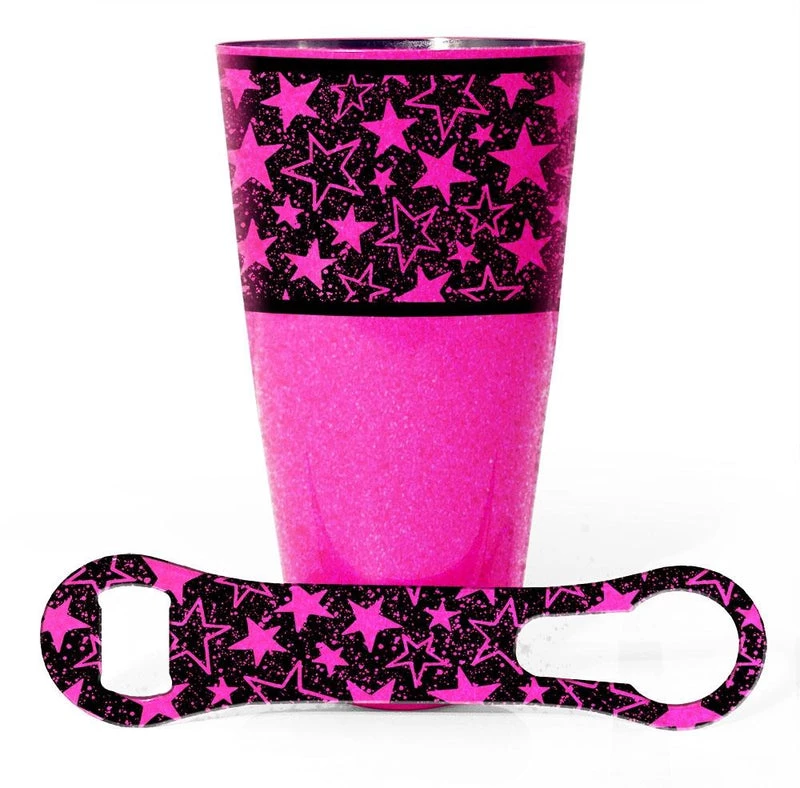 Every bartender knows that having the right bar tools behind the bar is essential, which is why we take great pride in offering the best and most unique styles. These 2 piece matching bartending sets showcase the popular 28 ounce weighted cocktail shaker along with a matching V-Rodยฎ Bottle Opener, both with a fun Grunge Stars design to add a little personality to your bar shift. Choose from Neon Pink , Neon Pink Glitter (which both glow under a black light) or standard stainless steel sets.