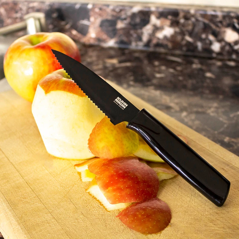 This serrated knife will cut flawlessly in the kitchen. It is made of sturdy Japanese stainless steel and is very sharp making it perfect for slicing many things in the kitchen such as tomatoes, bread, or a piece of meat. It measures 4″ in length and is made with a non-stick coating that ensures food will release from the blade, making each cut easier and neater. The matching colored sheath is great for protecting the blade in storage.