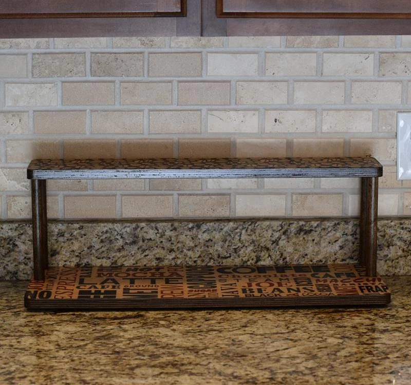 This particular shelf features a trendy coffee collage design imprint along with a smooth stained finish that easily wipes clean. They are also sold with rubber feet on the bottom, giving the shelf a bit of a raise from your counter while protecting it from scratches and bacteria build up.