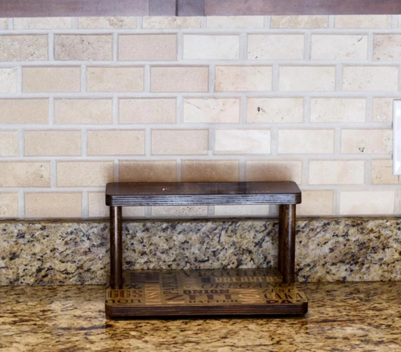 These 2 tier shelves are designed to fit perfectly on your counter underneath your cabinets, while still being able to easily access common spices and other ingredients. They are handcrafted in the USA, right here in our very own BPC woodshop. Counter Caddy Straight Shelves are constructed from a durable wood material with 4 secure 5.75″H dowel rods. This particular shelf features a trendy culinary collage design imprint along with a smooth stained finish that easily wipes clean. They are also sold with rubber feet on the bottom, giving the shelf a bit of a raise from your counter while protecting it from scratches and bacteria build up.