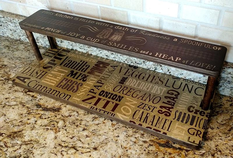 These 2 tier shelves are designed to fit perfectly on your counter underneath your cabinets, while still being able to easily access common spices and other ingredients. They are handcrafted in the USA, right here in our very own BPC woodshop. Counter Caddy Straight Shelves are constructed from a durable wood material with 4 secure 5.75″H dowel rods. This particular shelf features a trendy culinary collage design imprint along with a smooth stained finish that easily wipes clean. They are also sold with rubber feet on the bottom, giving the shelf a bit of a raise from your counter while protecting it from scratches and bacteria build up.