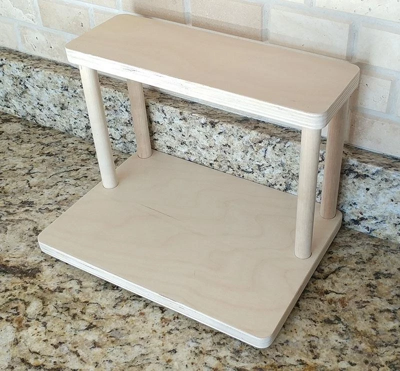 This particular shelf features a smooth natural finish that allows you to keep that natural look OR apply a stain/paint that perfectly matches your kitchen theme! They are also sold with rubber feet on the bottom, giving the shelf a bit of a raise from your counter while protecting it from scratches and bacteria build up.