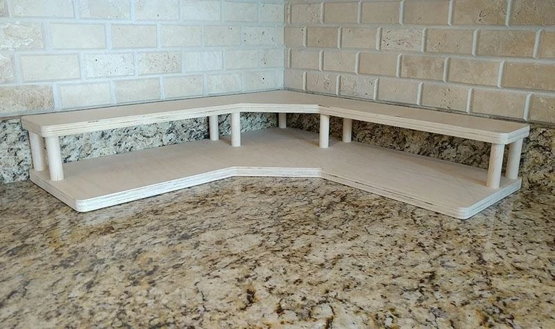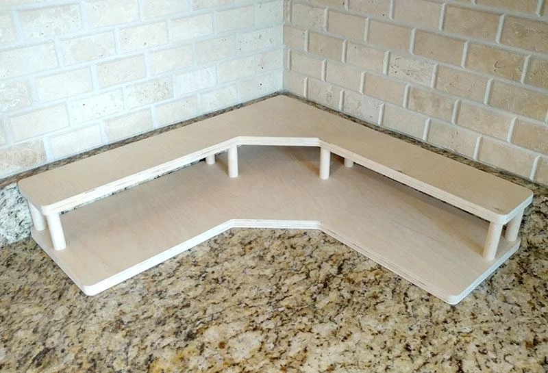 These 2 tier shelves are designed to fit perfectly underneath your cabinets, while still being able to easily pull standard sized liquor or wine bottles from the top tier. They are handcrafted in the USA, right here in our very own BPC woodshop. Counter Caddy Corner Shelves are constructed from a durable wood material with 9 secure 3.5″H dowel rods. This particular shelf features a smooth natural finish that allows you to keep that natural look OR apply a stain/paint that perfectly matches your kitchen theme! They are also sold with rubber feet on the bottom, giving the shelf a bit of a raise from your counter while protecting it from scratches and bacteria build up.