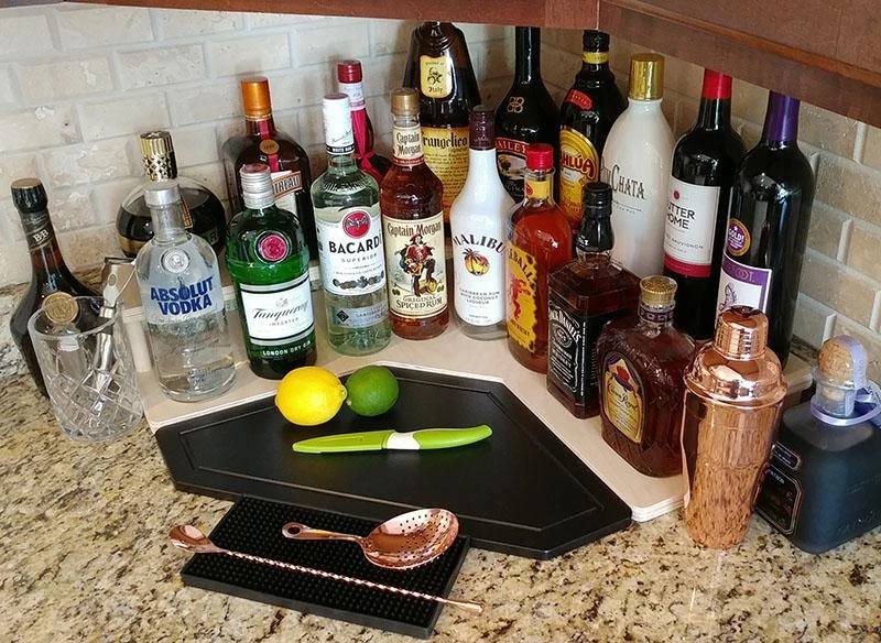 OPTION: This corner style also offers a fitted cutting board option! Use it to store your bar tools while not in use, and then have the ability to safely cut up lemons, limes and other garnishes while protecting your counter top.