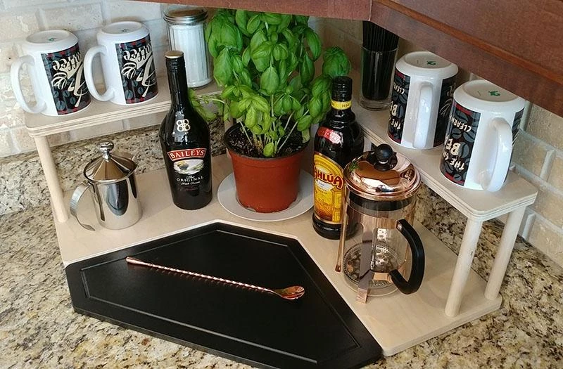 - Fits perfectly in the corner underneath your kitchen cabinets