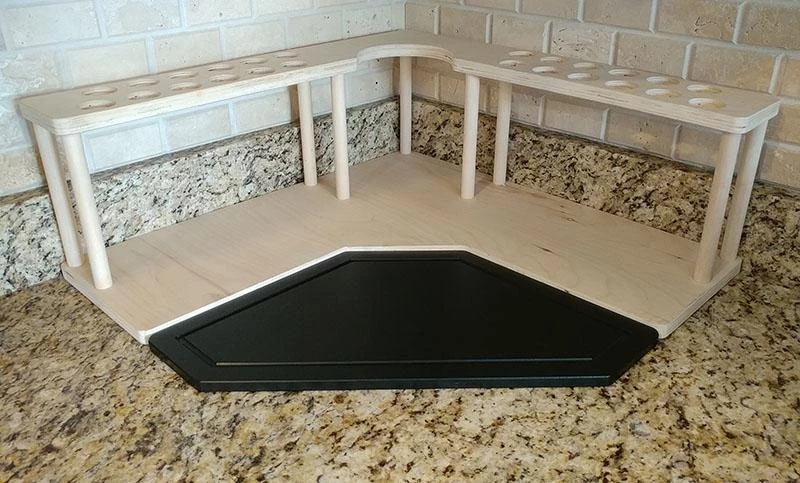 These 2 tier shelves are designed to fit perfectly in the corner, on the counter underneath your cabinets. The 7.5″ tall dowel rods lift the 2nd tier up, allowing the perfect amount of space on the bottom tier to hold your Barista related supplies such as sugars, creamers and other condiments. The top tier features (24) 1.5″ diameter slots to perfectly stock your K-Cups while the center of the unit showcases a half circle cutout that you can conveniently slide up to a 4.5″ diameter trash can into.