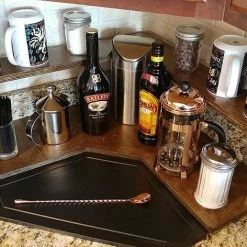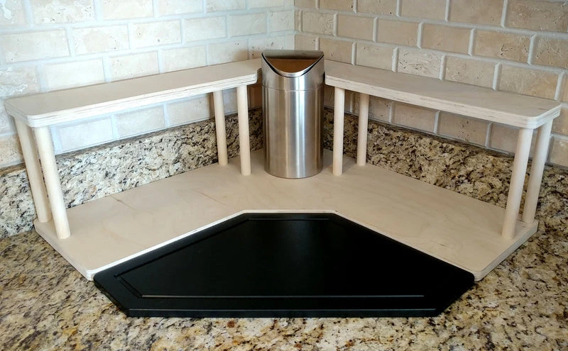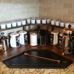 These 2 tier shelves are designed to fit perfectly in the corner, on the counter underneath your cabinets. The 7.5″ tall dowel rods lift the 2nd tier up, allowing the perfect amount of space on the bottom tier to hold your Barista related supplies such as sugars, creamers and other condiments. The top tier features a half circle cutout that you can conveniently slide up to a 4.5″ diameter trash can into.