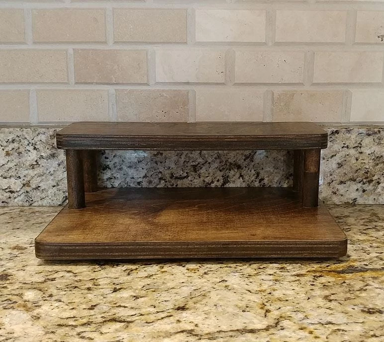 These 2 tier shelves are designed to fit perfectly underneath your cabinets, while still being able to easily pull standard sized liquor or wine bottles from the top tier. They are handcrafted in the USA, right here in our very own BPC woodshop. Counter Caddy Straight Shelves are constructed from a durable wood material with 4 secure 3.5″H dowel rods. This particular shelf features a trendy smooth stained finish that easily wipes clean. They are also sold with rubber feet on the bottom, giving the shelf a bit of a raise from your counter while protecting it from scratches and bacteria build up.