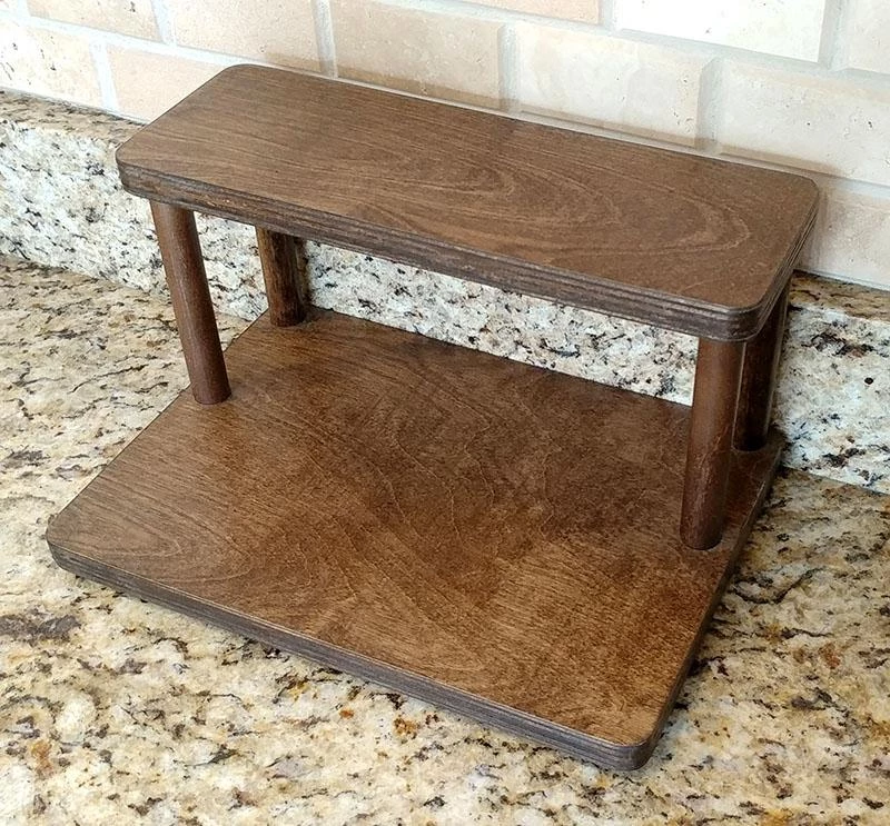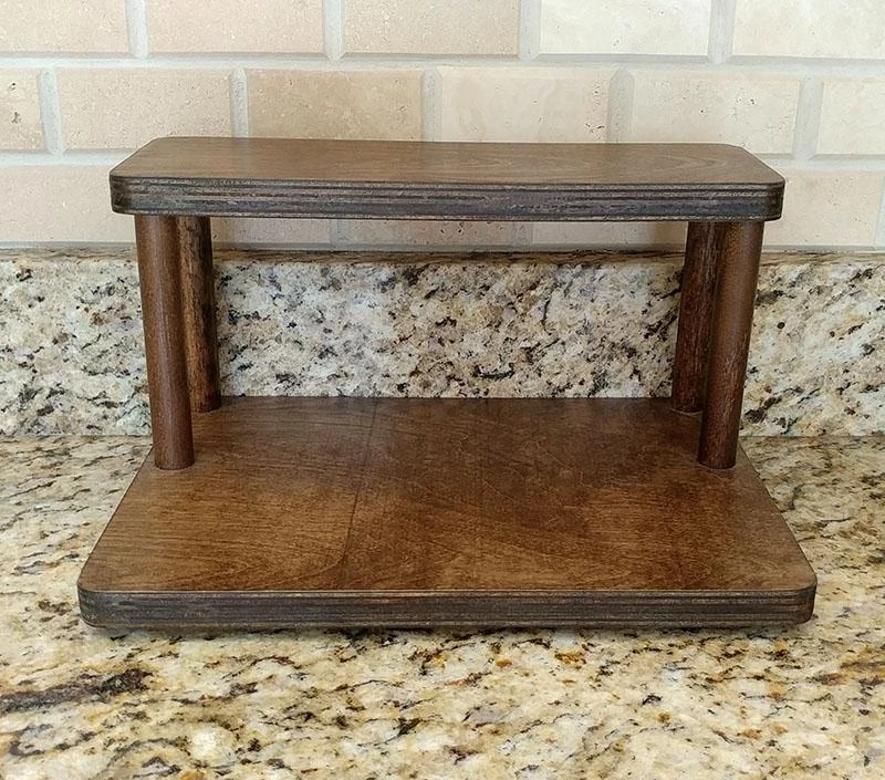 These 2 tier shelves are designed to fit perfectly on your counter underneath your cabinets, while still being able to easily access common spices and other ingredients. They are handcrafted in the USA, right here in our very own BPC woodshop. Counter Caddy Straight Shelves are constructed from a durable wood material with 4 secure 5.75″H dowel rods. This particular shelf features a smooth stained finish that easily wipes clean. They are also sold with rubber feet on the bottom, giving the shelf a bit of a raise from your counter while protecting it from scratches and bacteria build up.