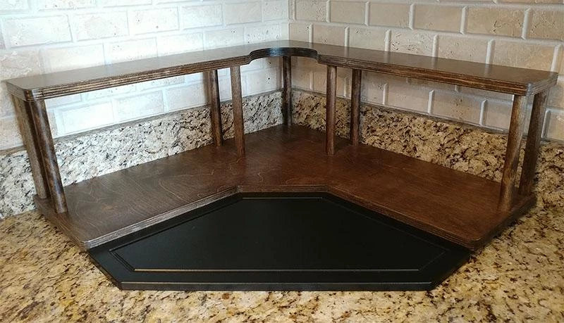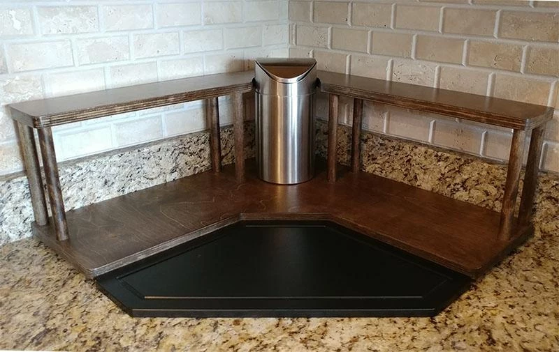 These 2 tier shelves are designed to fit perfectly in the corner, on the counter underneath your cabinets. The 7.5″ tall dowel rods lift the 2nd tier up, allowing the perfect amount of space on the bottom tier to hold your Barista related supplies such as sugars, creamers and other condiments. The top tier features a half circle cutout that you can conveniently slide up to a 4.5″ diameter trash can into.
