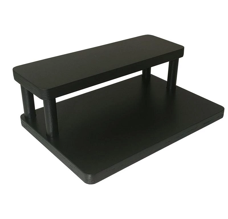 These 2 tier shelves are designed to fit perfectly underneath your cabinets, while still being able to easily pull standard sized liquor bottles from the top tier. They are handcrafted in the USA! Counter Caddy Straight Shelves are constructed from a durable wood material with 4 secure 3.5″H dowel rods. This particular shelf features a smooth black finish that easily wipes clean. They are also sold with rubber feet on the bottom, giving the shelf a bit of a raise from your counter while protecting it from scratches and bacteria build up.