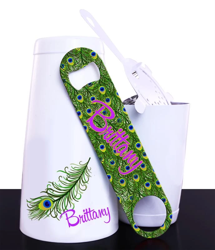 This beautiful peacock design is the perfect canvas for some personalization. Place your name on this cocktail shaker set and you will have the perfect set for home or a conversation starter when creating drinks behind the bar.