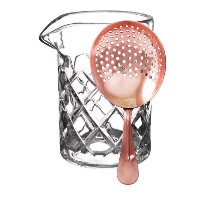 This BarConic® cocktail tool set combines a medium-sized Diamond Pattern Mixing Glass and a Copper Plated Julep Strainer that fits perfectly atop it.