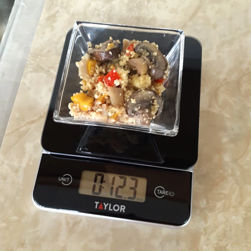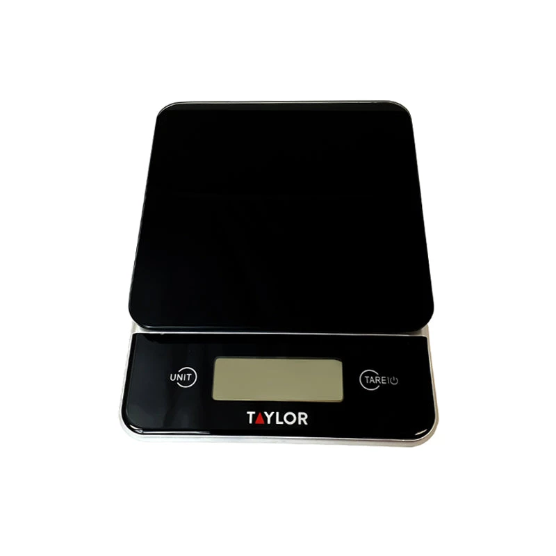 Black glass digital kitchen scale. Controls are easy to use and switch between containers and food for preparation. Has a large display with auto shut off that conserves battery life. Clean with a damp cloth, do not immerse in water or place in the dishwasher. Measures 7.5โ x 5.5โ x 0.75โ. Max weight is 11 lbs.