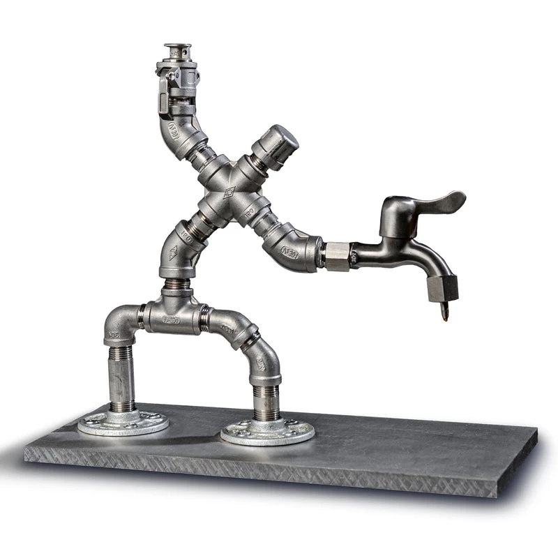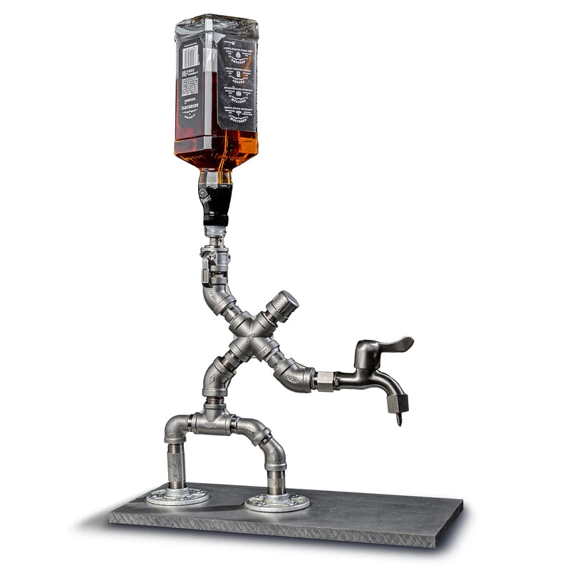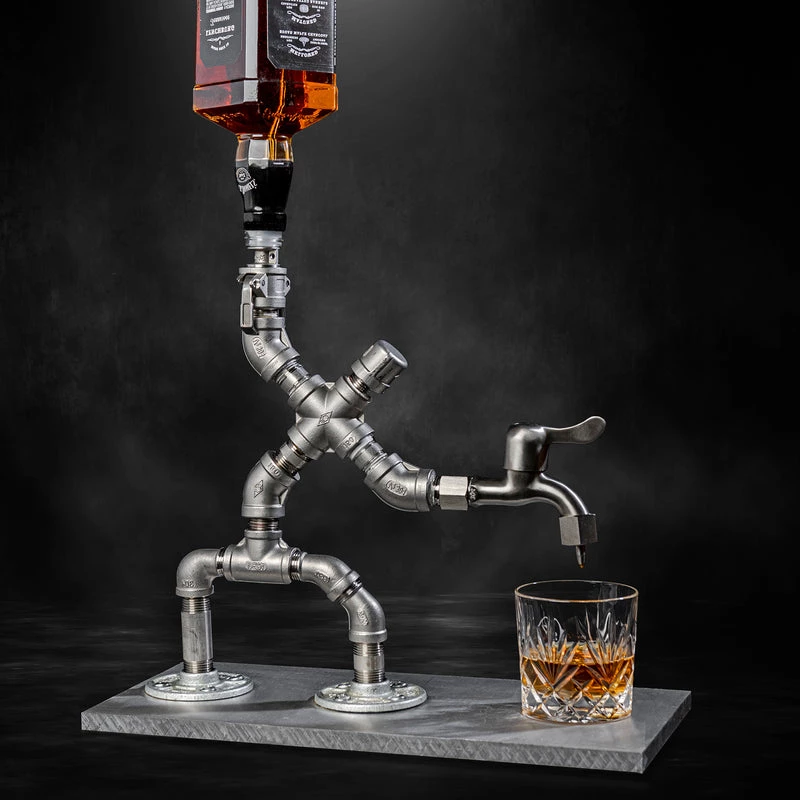 Aย Steampunk inspired liquor dispenser. The silicone covered cam for this dispenser is designed to fit standard bottle openings (0.75โ inner diameter). In cases where the opening is slightly larger 2 expanders have been included. Also if you would like a bigger spigot you can replace it with a wider one. A cover for the vent escape has also been included. Comes with a 15 ยฝโ L x ยฝโ W wood veneer base. The creamy brown base compliments many different alcohols. Assembly instructions have been included. Safe and hygienic, very suitable for daily use. Just turn the spigot gently, and watchย theย glass be filled with your favorite spirits.