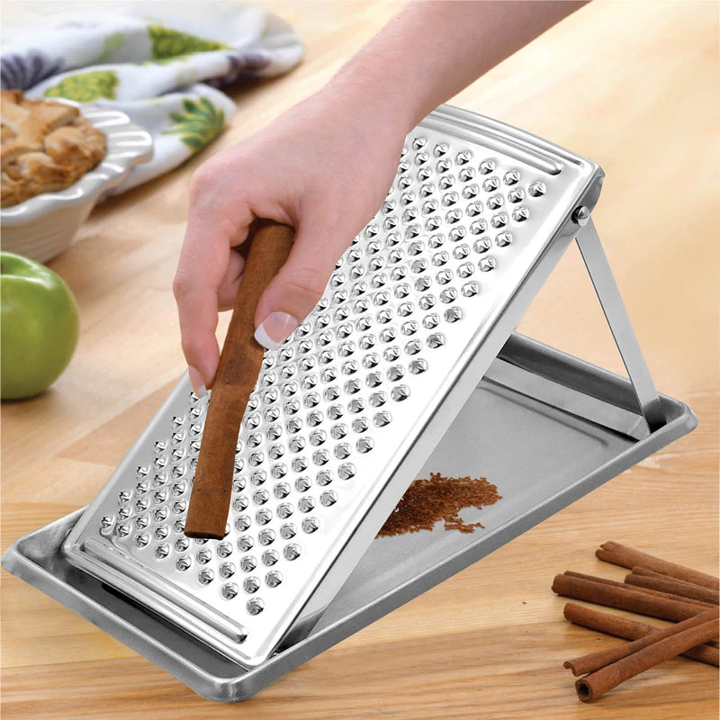 This strong unit is a must have for your kitchen. The foldable BarConic® Grater is a tool that is necessary for anyone who loves to cook. The foldable mechanism in this tool allows you to be able to store it in tight spaces. Simply lift the grater out of the tray and pull down the handle and lay it flat against the tray and you have an easy way to grate a variety of foods. It is made of durable stainless steel and is 8.5″ long and 4.25″ wide.