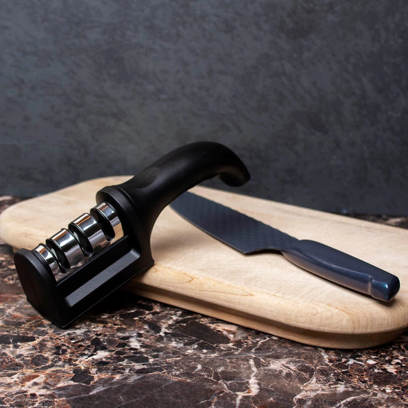 This knife sharpener is a must need tool that should be used often in your kitchen. Sharpening knives is essential when cooking or prepping for food or garnishments for cocktails.ย It has three different slots of sharpeners and has multi-hand functionality. Whether you’re using your left or right hand to hold the handle, it feels comfortable to use. It measures 8″ in length.ย It has a rubber bottom attached to the bottom of the tool to prevent any slippage making them safe to use. Just run the knife through the grooves and you’ll notice a difference in minutes.