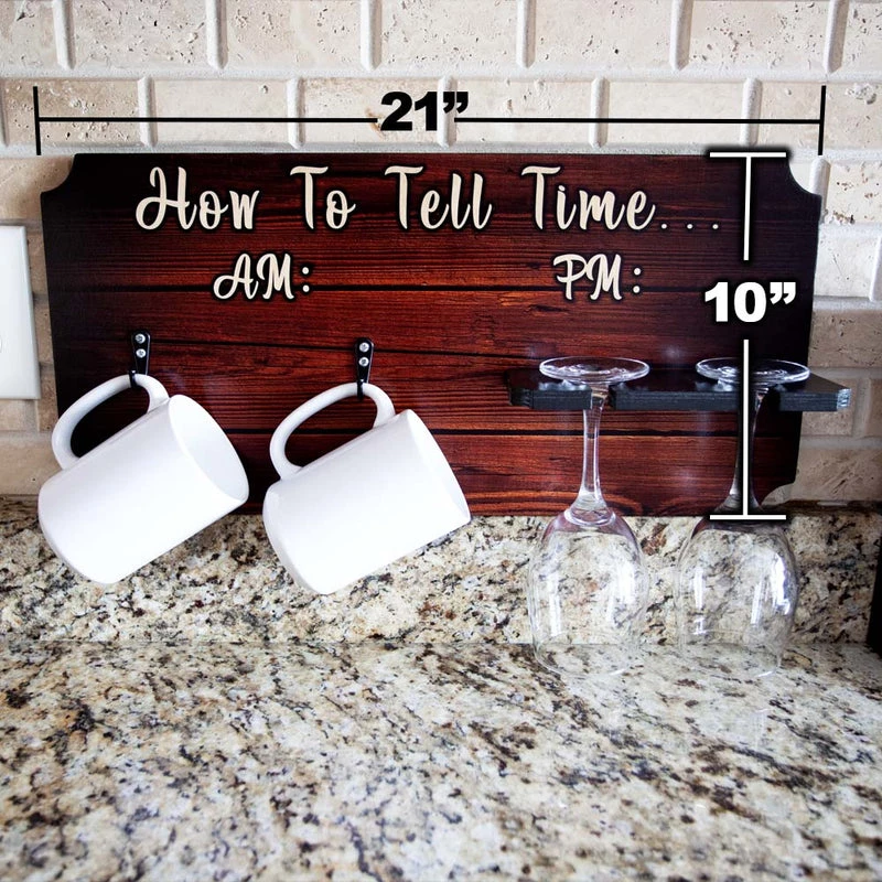 Crafted out of high-quality birch plywood, our โHow To Tell Timeโ Mug and Wine Glass Holder is a charming and humorous way to store your mugs and wine glasses, convenient and ready to help kickstart your morning or wind down your evening!ย This rustic wood sign rack holds 2 mugs and 2 wine glasses and comes ready to hang with hardware pre-installed.