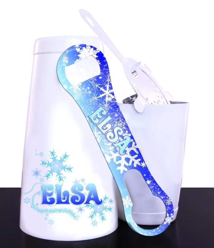 Note that the more letters you request the smaller the font size will be on the opener and cocktail shaker set. We recommend no more than 15 characters.