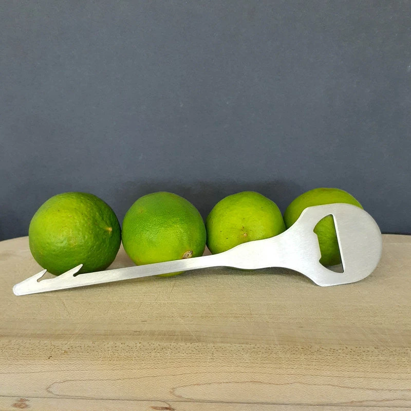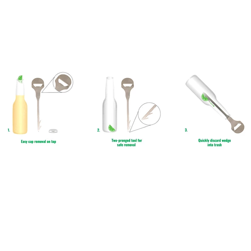This two-in-one stainless steel tool comes equipped with a beer bottle opener and a lime wedge extractor. Now you can uncap the beer bottle and safely remove that pesky lime from the empty Corona bottle with one tool. Remove the lime from a beer bottle to meet recycling guidelines, prevent mold and deter fruit flies.. Simply insert the extracting tool into the bottle, hook the wedge, and pull the lime out. Measures 8” in length.