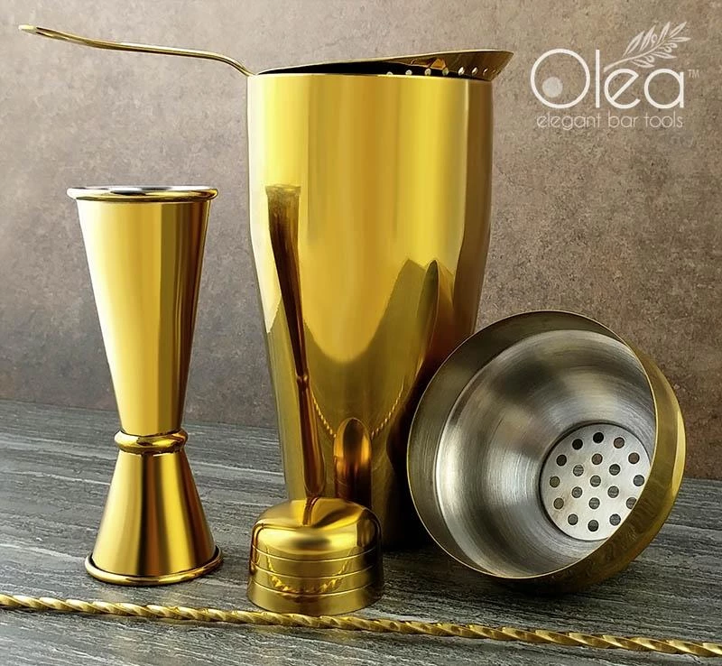 Absolutely exquisite are the perfect words to describe this stunning Gold Plated 4 piece Bar Set. A collection of many first editions of our line of Olea™ Elegant Bar Tools, this bar kit is every master mixologists and professional bartenders dream bartending kit. The high quality pieces are constructed from a durable stainless steel material and then beautifully plated with a reflective Gold finish.