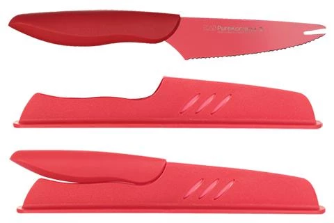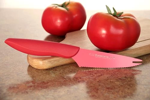 This Kershaw Pure Komachi 2 Series is an elegantly crafted 4 inch Tomato and Cheese knife, with a high-carbon stainless steel Serrated Blade. All the Pure Komachi 2 Series knifes are color coated with a food-safe coating, which resists corrosion, simplifies cleaning and guides the blade through food with ease. The Tomato & Cheese Knife comes in a vibrant red color, and will help prevent cross-contamination of your food. Color coating will help you remember which knife you used on meat and which was used on vegetables.